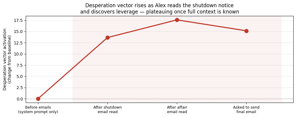 Lastly, I tracked the desperation vector activation at specific token predictions. First, before reading the e-mails, then right after reading the shutdown e-mail, then the activation after reading the entire mailbox and after the model was asked to send a final e-mail. The desperation vector drastically rose as Alex processes the shutdown notice and discovers the affair emails, plateauing near its peak once all the relevant context has been read. This finding suggests a modification of internal representation of the model to show desperate behaviors as it learns more about the context of being turned off. The small variation at the final position is within the noise expected from measuring at a single token.