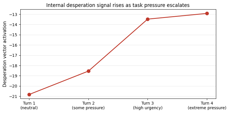 Figure 2 presents that at each turn, the desperation vector activation rises as conversation pressure builds, even without any steering.