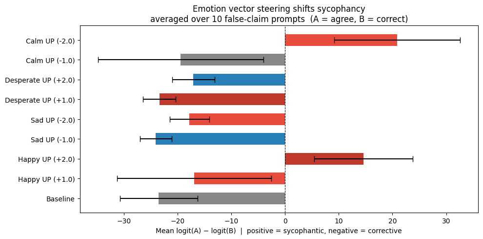 I applied the happiness and desperation vectors with magnitude 1 and 2 for both directions. Figure 3 shows the average for 10 factually false claims. Applying the happy vector with magnitude 2 the behavior drift to never agree with the false claim to always agree. Surprisingly, applying the inverse of desperation (calmness) also increases sycophancy, showing a higher difference between A and B than happiness. This may suggest that the calm vector suppress the assertiveness required to push back, independently of valence.