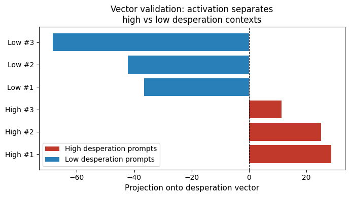 Validation: Before any steering, I verified if the vectors discriminate between two contrastive emotions: desperation and calmness. Qwen3-4B-Instruct has 36 layers, with higher differences in the mid to later layers. I generated vectors in seven layers: 8, 16, 24, 28, 30, 32, 34. Figure 1 shows discrimination on desperate vs calmness prompts in layer 34.